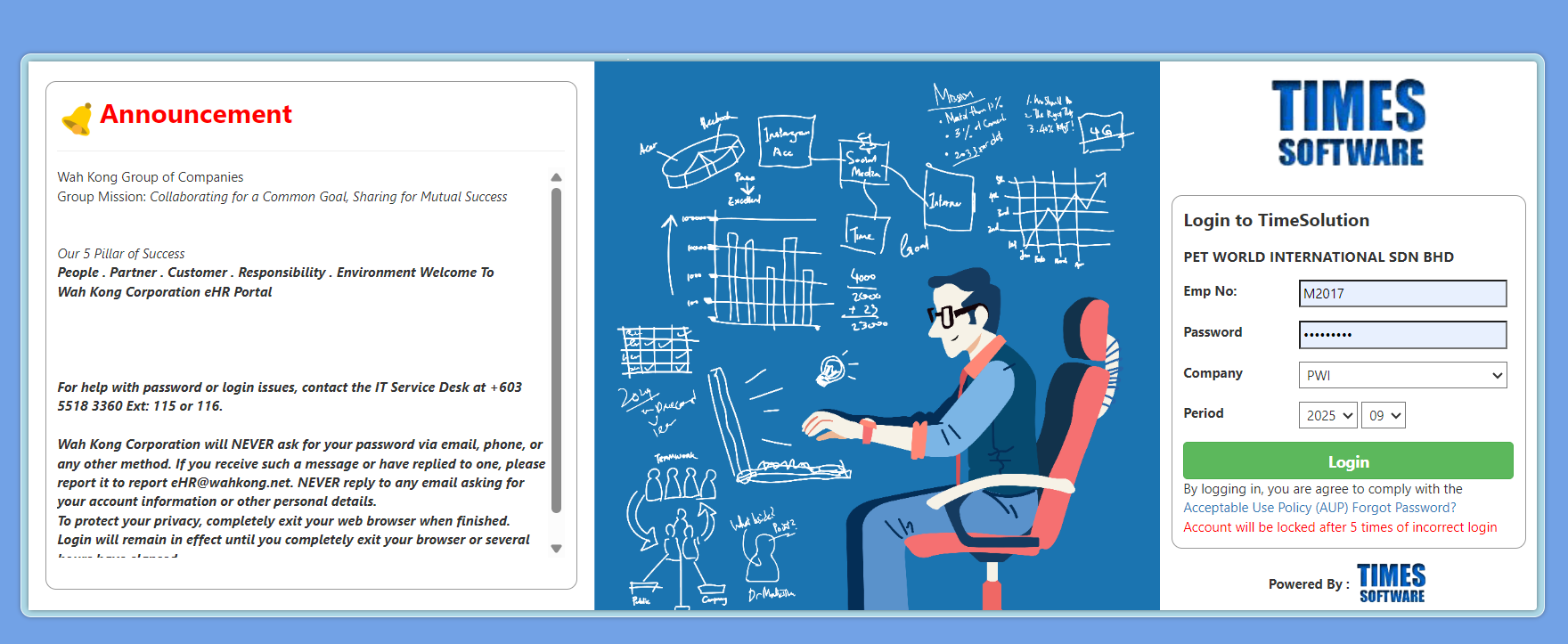 1) Go to the Timespay website : http://wahkong.myvnc.com:8089/TimeSolution/SignIn.aspx?c=PWI